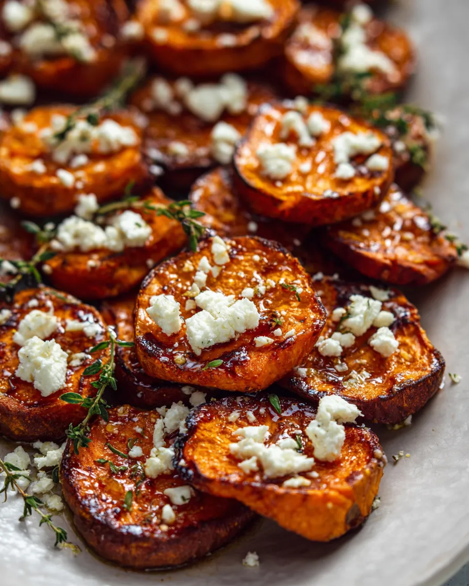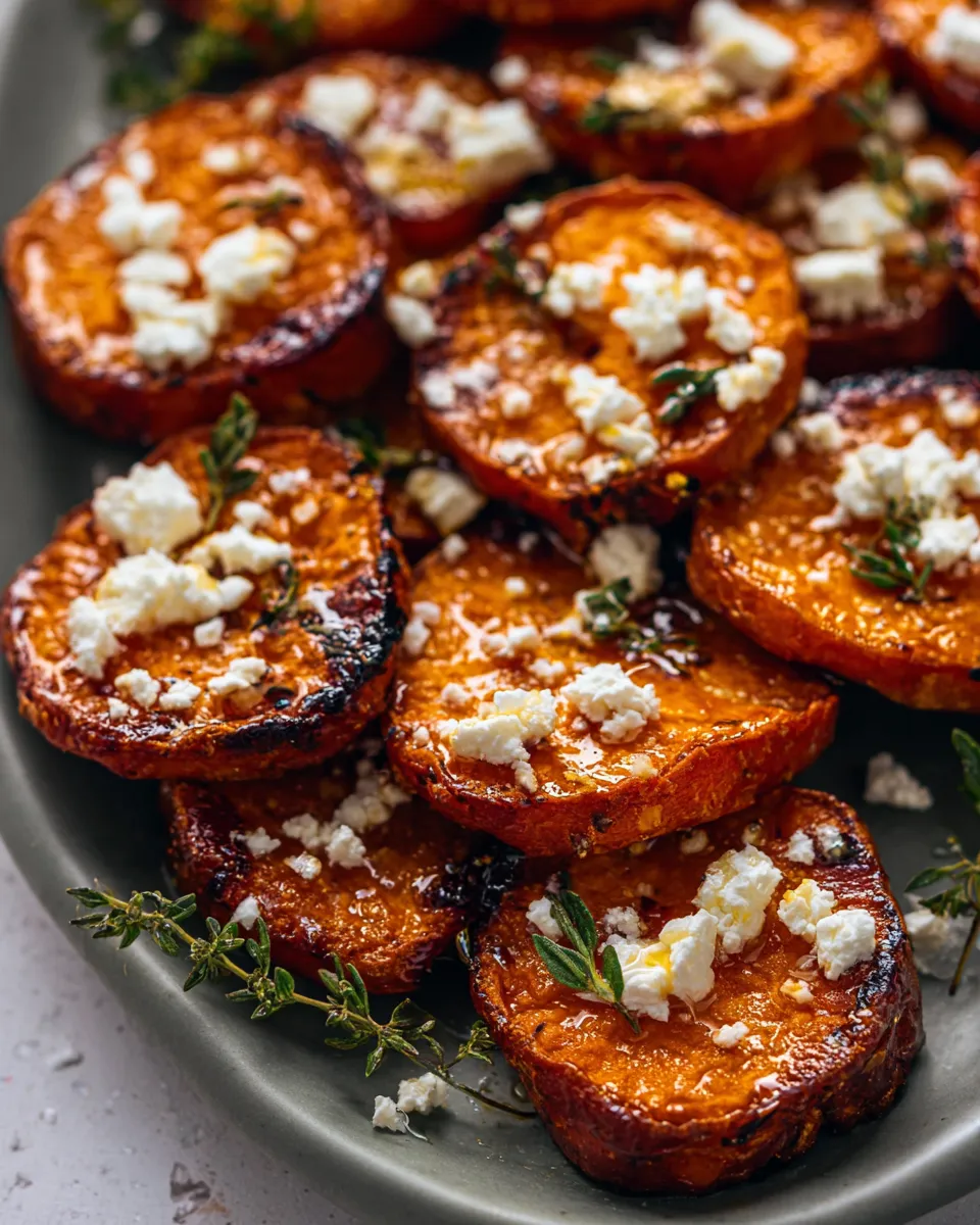 Try crumbled goat cheese, cotija, or a dairy-free feta alternative. If you skip the cheese altogether, you’ll have a lighter, crisp sweet potato round with honey and herbs—still delicious.