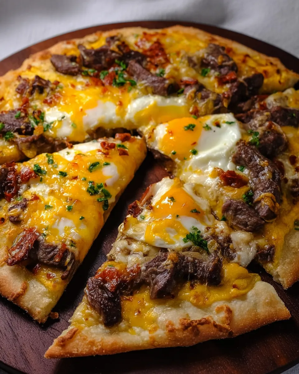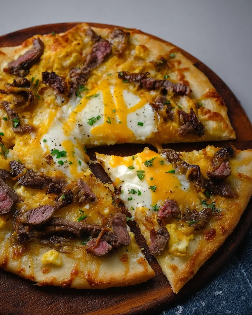 Think crispy edges, melted cheese, perfectly seasoned steak, and a sunny egg perched on top—the kind of slice you crave with a hot cup of coffee while the kitchen smells like garlic and sizzling beef. It’s flexible, too: swap in your favorite veggies, switch up the cheese, or go meatless with mushrooms and spinach. Welcome to a breakfast that tastes like a victory lap for your taste buds.